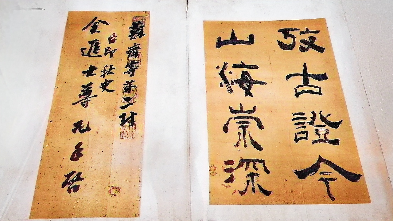 추사의 과지초당 청나라 금석학자 소재(蘇齋) 옹방강의 글씨도 새로웠다. 옹방강이 김정희에게 보낸 편지를 묶은 <담계수찰첩> 속의 '고고증금 산해숭심(攷古證今 山海崇深)' 글씨는 옹방강과 추사가 얼마나 밀접한 관계인가를 여실히 증명한다. 추사박물관에 전시된 '고고증금 산해숭심'은 일본의 추사 연구가 후지츠카 치카시 교수가 영인한 것으로 위작(僞作) '산숭해심 유천희해(山崇海深 遊天戱海)'의 모본이 된 글씨로도 유명하다.