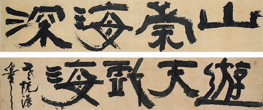 옹방강의 <담계수찰첩>과 '고고증금 산해숭심' 이 글씨를 바탕으로 하여 어떤 사기꾼이 아래의 '산숭해심 유천희해(山崇海深 遊天戱海)'이라는 글씨를 썼다. '산은 드높고 바다는 깊으니, 하늘에서 즐기고 바다에서 노닌다'는 의미의 이 글은 207x 42cm의 대작으로서, 경로는 알 수 없으나 호암박물관을 거쳐 지금은 리움미술관에 전시돼 있다. 물론 추사 진품으로서의 가치를 지니고서이다. 하지만 감히 말하거니와 이것은 절대 추사의 작품이 아니다.
