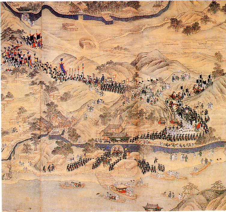 강화행렬도 / 이원범을 데리러 온 관리들의 행렬과 이를 구경하는 사람들을 그렸다. 149x434cm의 12곡 병풍의 일부로 평양 조선미술박물관 소장품이다.