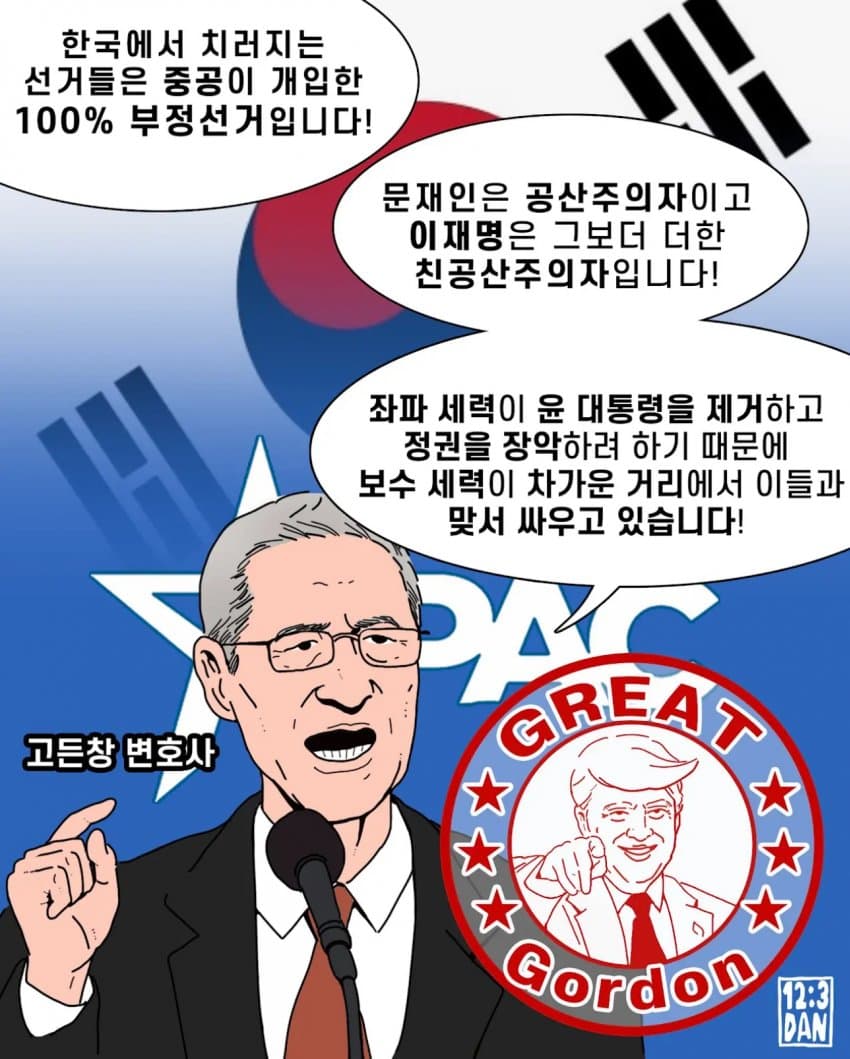그는 올해 초 탄핵 국면에서 미국 동아시아연구소(EARC)의 연구원 자격으로 미국 내 여러 토론회에 나와 "윤석열 탄핵 위기에 처한 현 상황은 부정선거의 배후로 의심되는 중국 공산당과 북한이 연루된 광범위한 음모의 일부"라고 성토하며, '한국 민주당과 중국 공산당의 연계 의혹'과 '지난 2020년 총선에서의 부정선거 증거' 등을 자료 화면을 통해 설명하기도 했는데, 고든 창 등의 우파 인사와 함께 이를 확신하고 있는 그는 그 부정선거의 배후로 중국 '차하얼(察哈爾)학회'를 주목하고 예의주시 중이다.