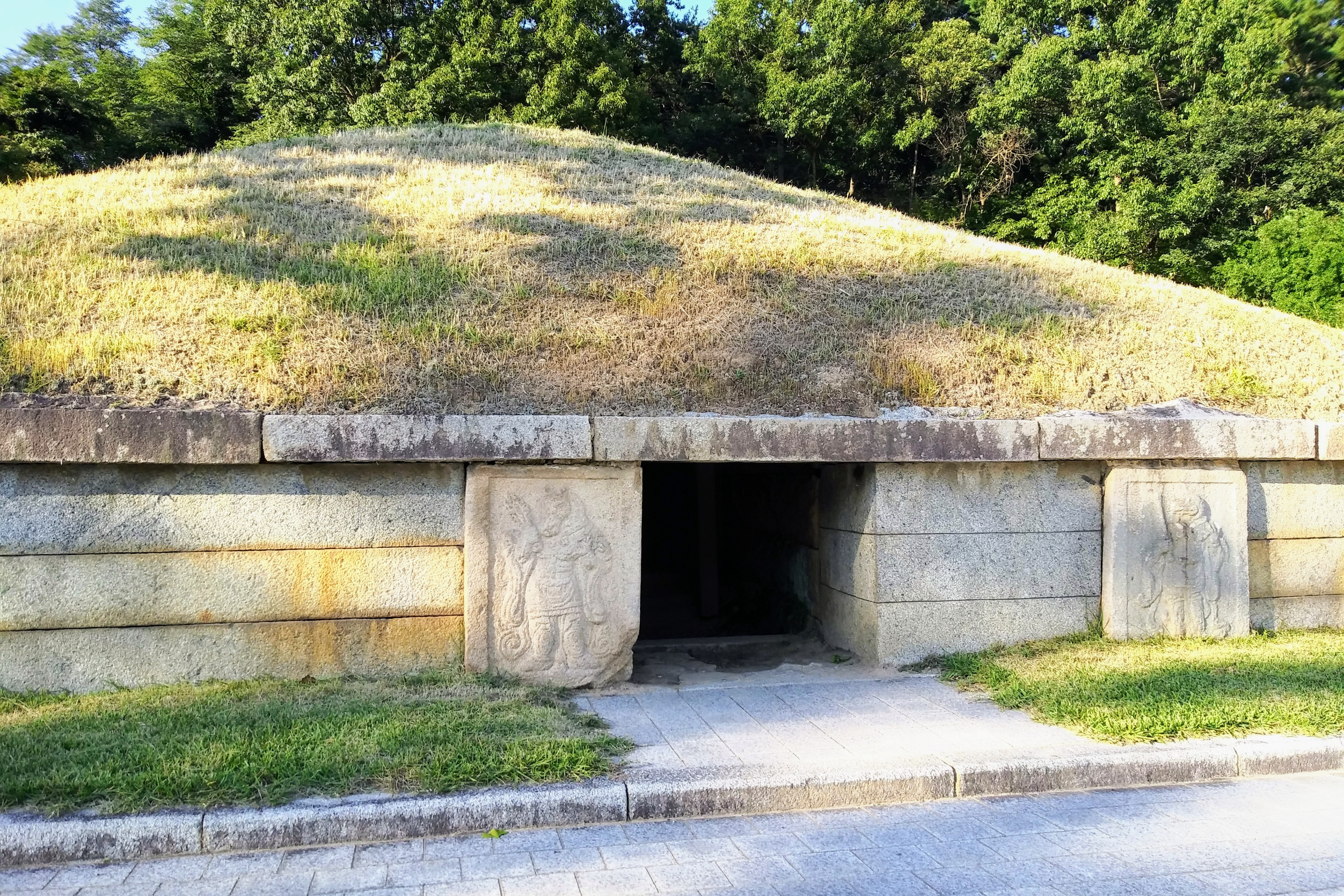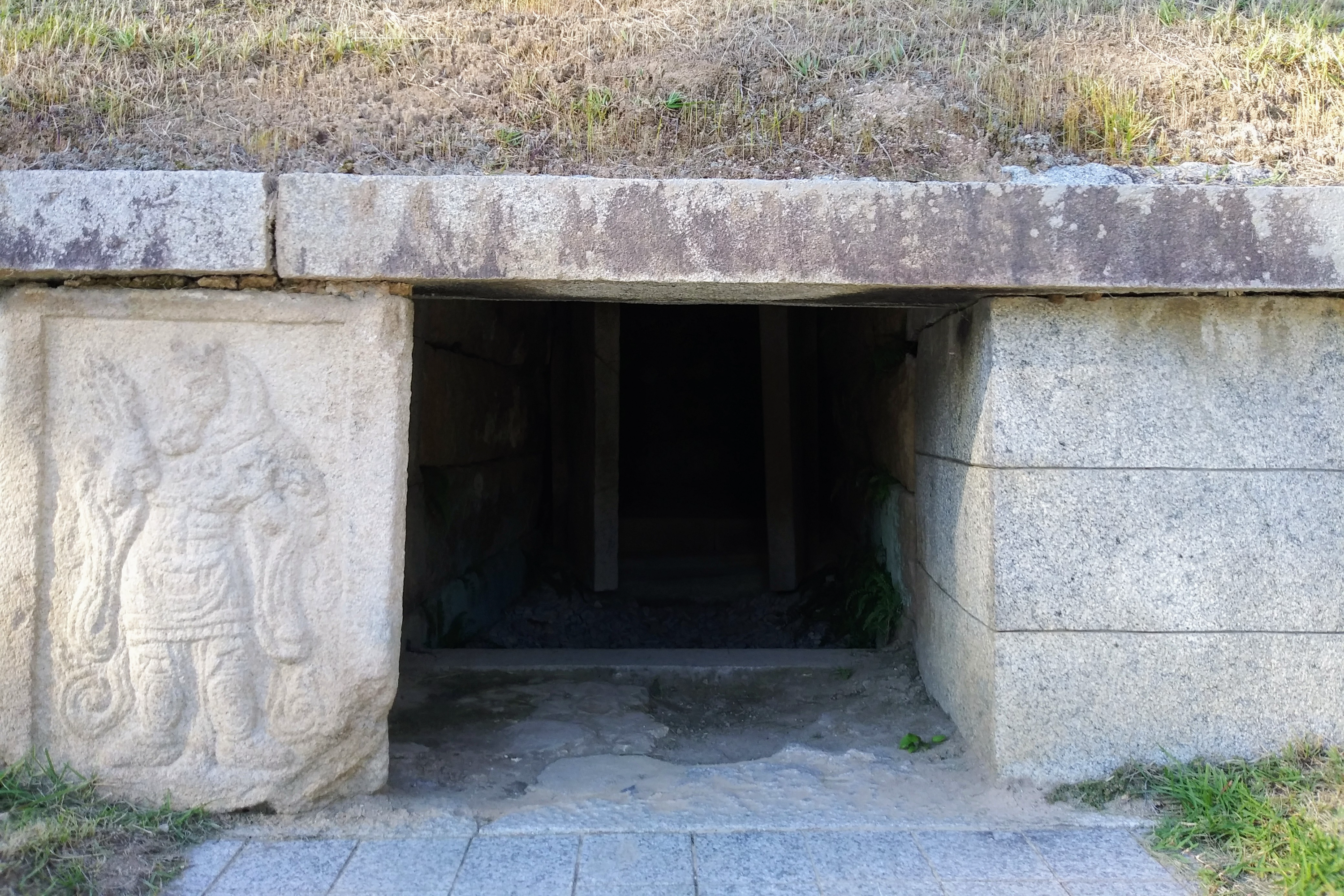 경문왕릉으로 비정되는 경주 구정동 방형분 / 경문왕 김응렴은 신라 48대 희강왕의 손자다. 경문왕은 아이러니하게도 희강왕과 왕권을 두고 죽고 죽이는 싸움을 벌였던 헌안왕의 사위가 되며 왕위를 이어받았다. 궁예는 이와 같은 당대 권력싸움의 희생양일 듯싶다.북서쪽에서 찍은 사진 / 호석에 12지신상과 폴로를 든 서역인상을 세웠으나 서역인상은 국립경주박물관으로 옮겨졌다.무덤 입구의 12지신상문이 열려 있어 엎드려 들어가볼 수도 있었으나.대구일보의 사진을 빌려왔다. / 안상문의 석관이 보인다.