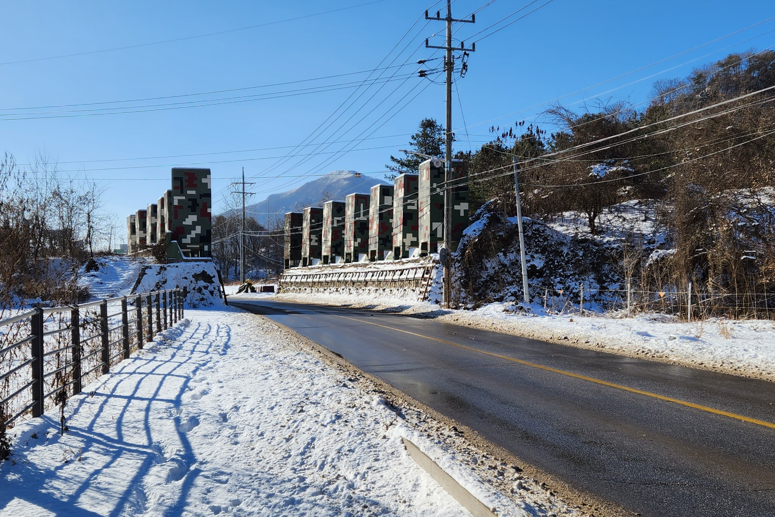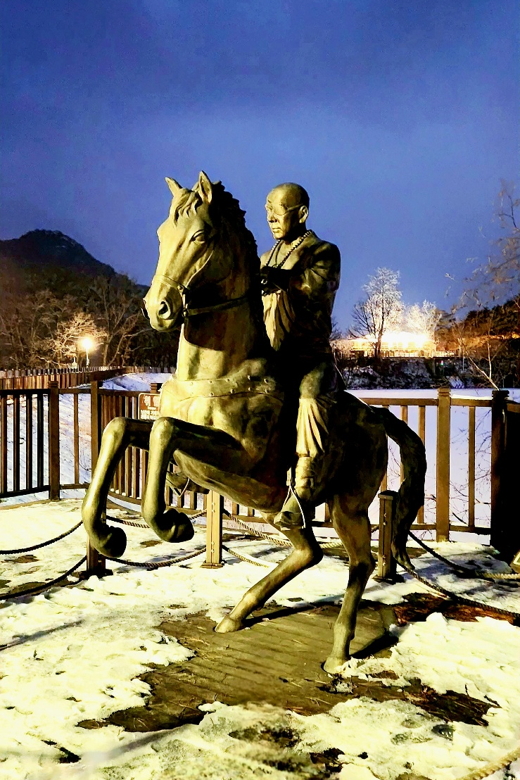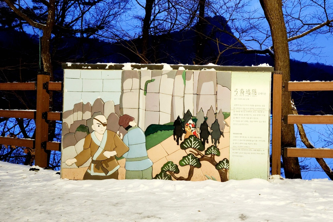 눈 덮힌 산정호수에서 바라본 명성산산정호수의 도망가는 궁예 그림산정호수의 궁예 동상