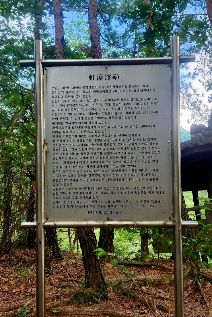 궁예의 전설이 쓰여 있는 전망대 홍폭(=무지개폭포) 안내문전망대에서 당겨 본 무지치폭포하산길에 가까이서 찍은 사진무지치 폭포 겨울철 빙벽등반타이탄산악회 등반사진첩에서 발췌