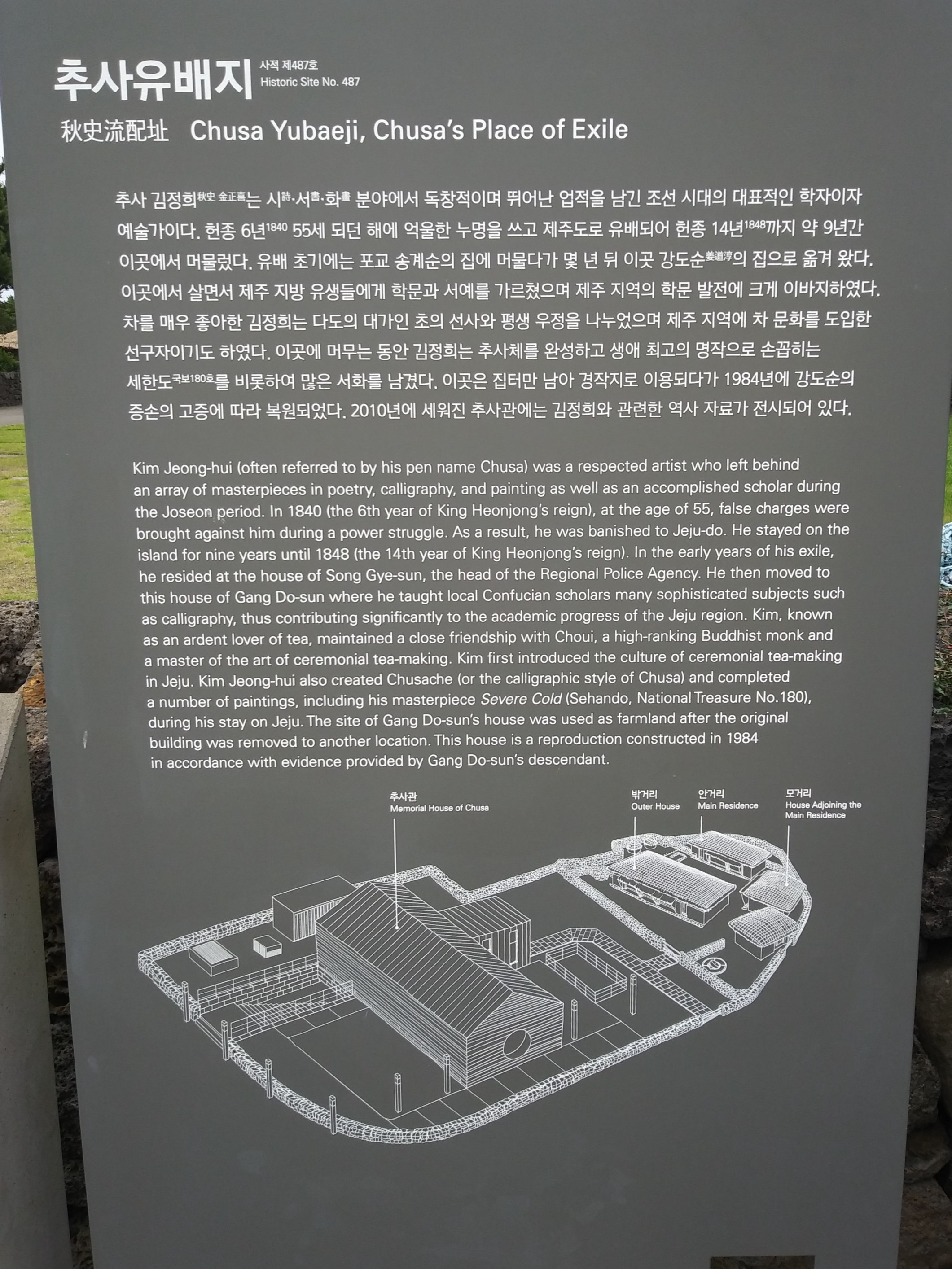 그때가 1840년(헌종 6) 쉰다섯 살 때였다. 전주, 남원, 나주, 해남, 강진을 거쳐 김정희가 도착한 곳은 제주도 북쪽의 화북포구로서, 이후 김정희는 제주목 관아에서 형식적인 조사를 받고 대정현으로 이송돼 대정현 군교(軍校) 송계순의 집에 위리안치된다. 2년 뒤 그는 대정현 갑부였던 강도순의 집으로 옮기게 되는데, 이때부터는 몸이 제법 자유로워졌던 듯 대정현 향교에 현판 글씨도 써주고 후학들도 키우고 하였다.