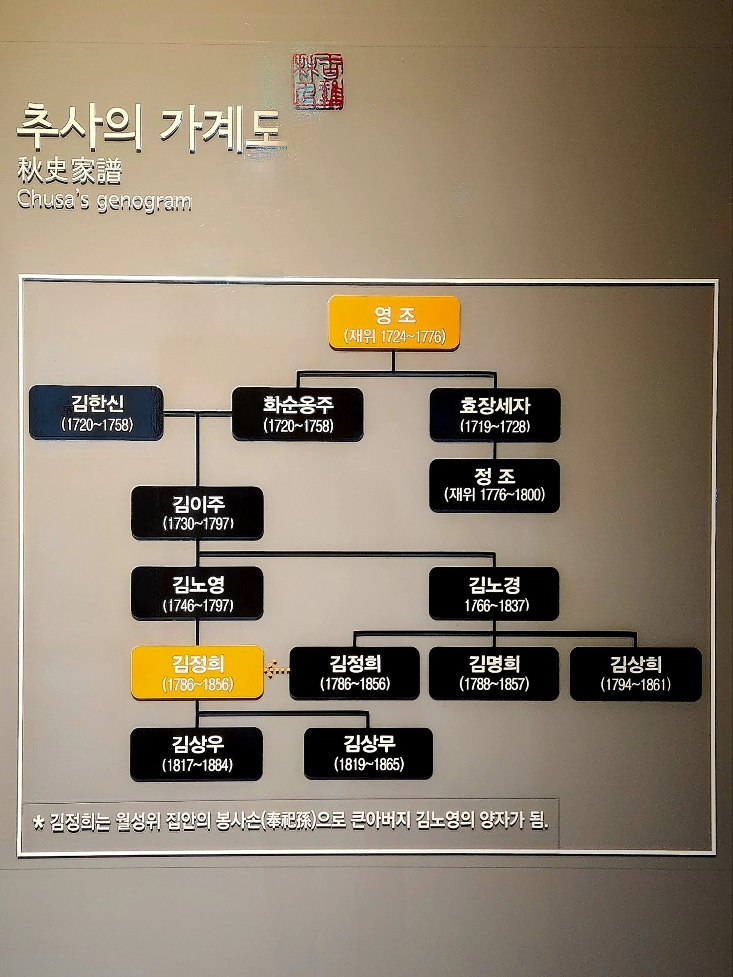추사 김정희의 가계도 추사의 집안은 한때 영조의 계비 정순왕후(추사의 12촌 고모)를 주축으로 노론 벽파를 이끄는 세도가문으로 군림했다. 추사는 1819년(순조 19) 문과 합격 후 병조참판에까지 올랐고, 순조의 아들 효명세자를 가르치는 필선이 되었다. 그러나 1830년 효명세자가 급서하자 안동김문이 다시 발호하였고 김노경 부자는 숙청되어 유배를 갔다. 이에 관한 스토리는 '제주의 추사 김정희와 위작 '추수백운도'에서 다룬 바 있다.