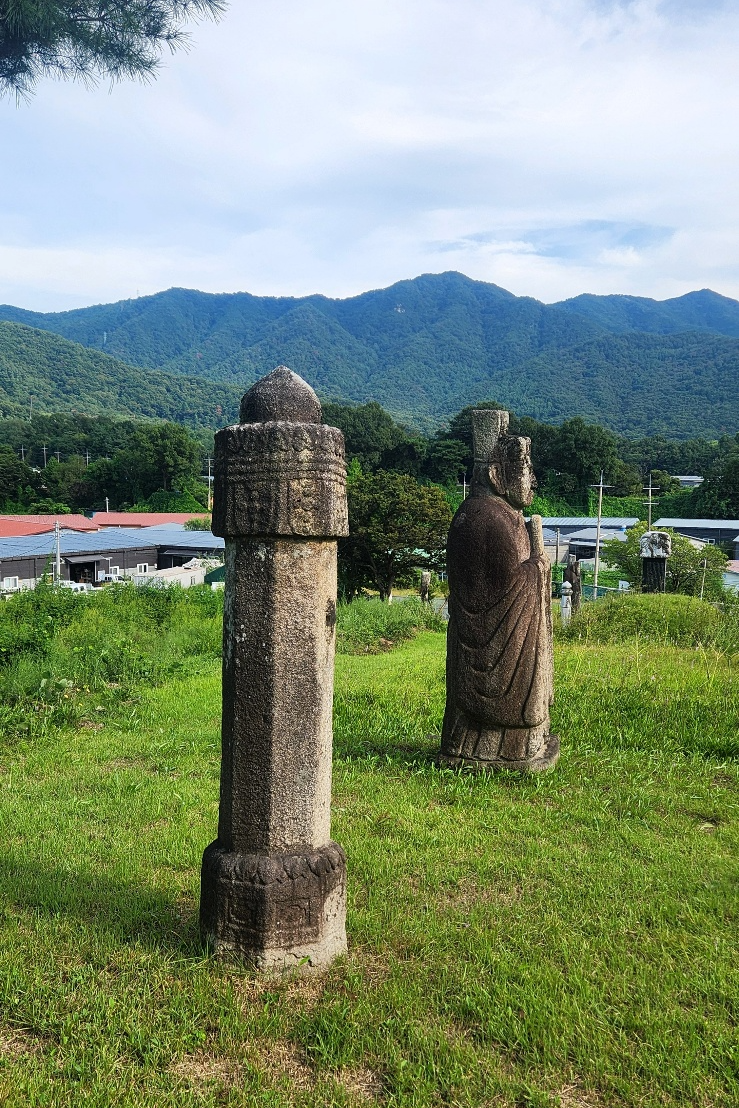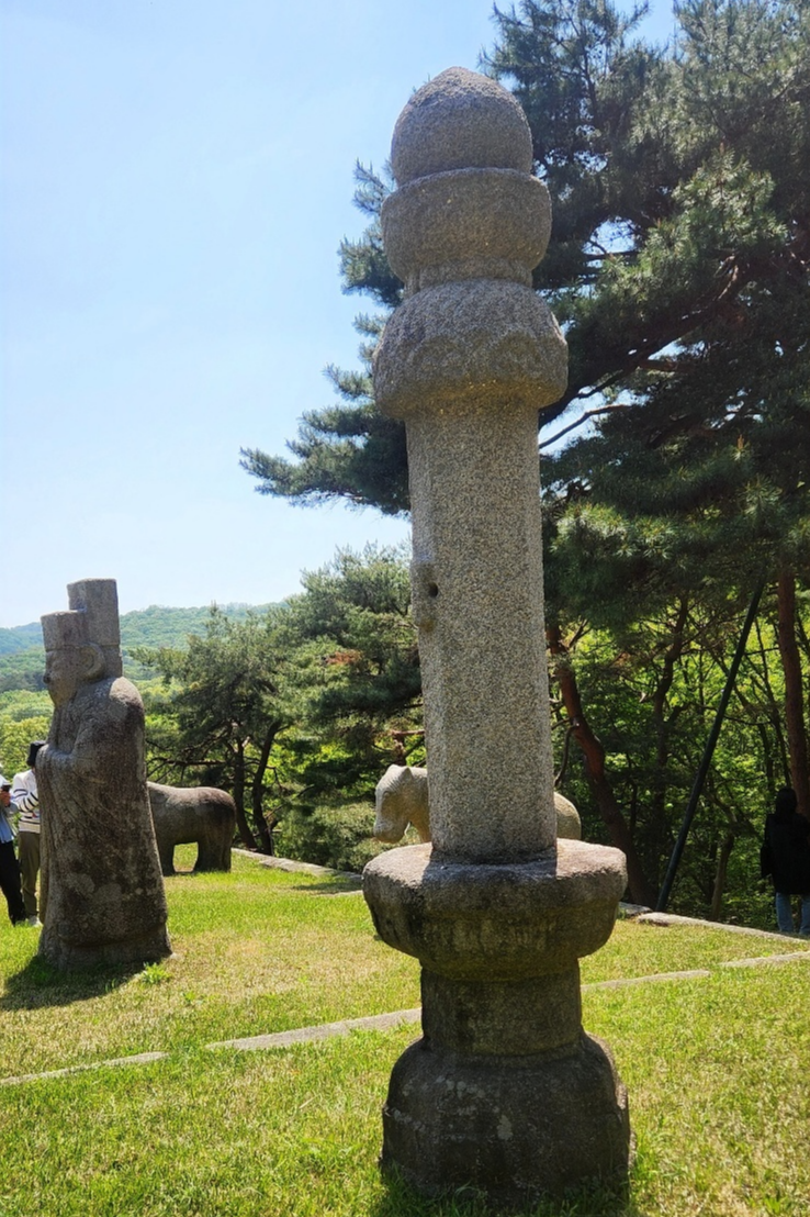 좌측 망주석과 문석인 / 앞에 서 있는 사람과 크기가 비견된다.