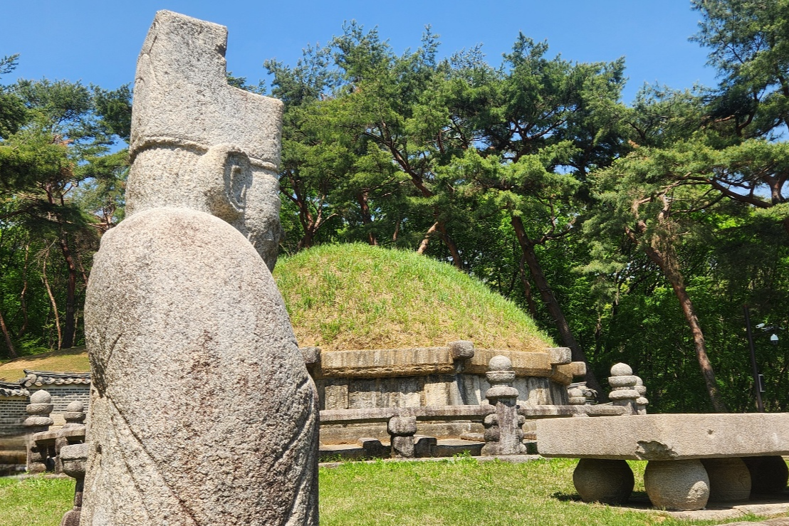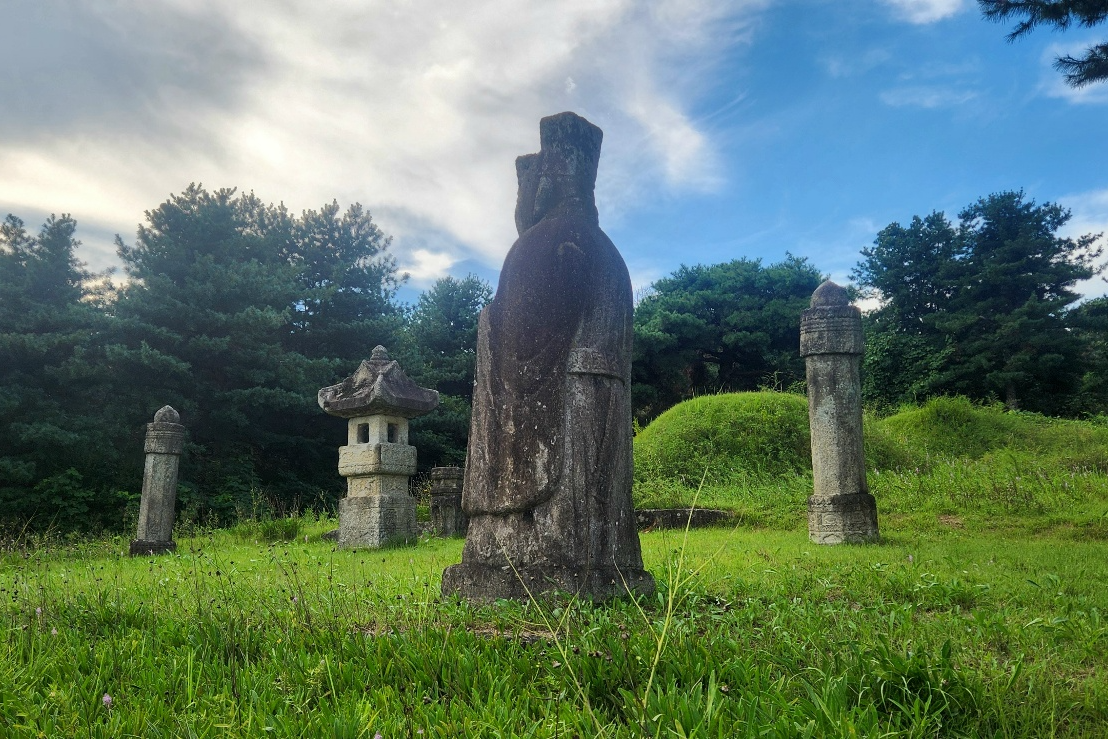 남양주시 와부읍 도곡리 산31에 있는 박원종 무덤의 문석인은 이제껏 내가 본 조선시대의 어느 석인상보다도 크다. 그 크기는 태조 이성계 무덤인 건원릉 문석인을 능가한다. 사대부 무덤 문석인의 크기가 왕릉의 것을 능가하는 것은 사실 불법이다. 이에 대해 잠시 설명 드리자면, 조선 왕릉의 경우 <국조오례의 / 흉례>에 문인석은 높이는 8척 3촌(약 250cm), 무인석은 9척(약 270cm)이라고 명시되어 있다.