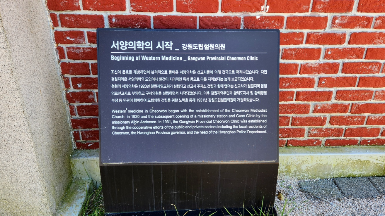 강원도립 철원의원의 안내문 / 1920년 건립된 철원제일교회의 앤더슨 선교사가 철원에 구세의원을 설립한 것이 철원지역 서양의학의 시작이라고 설명돼 있다.
