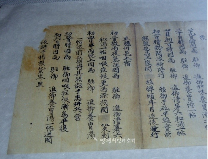 <임오유월일기> 양평 관련 부분/ 기록자는 한약에 정통한 듯 여러 병환에 시달리는 민황후에게 그때 그때 약을 조제해 주었다. (양평시민의 소리 DB)양평군 양동면의 '현감 안정옥 가옥' / 작은 사진처럼 내부구조는 옛모습 그대로에 가깝다. 밑의 사진은 마당에 놓인 용도 모를 큰 돌들이다. 큰집을 짓기 위한 석재인 듯하다. (오마이뉴스 DB)