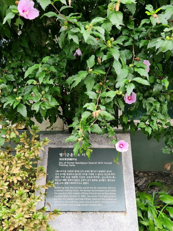 별기대의 군인들 / 외양상으로는 후져 보이나 서유럽의 소총이 지급된 신식군대였다.서울 종로구 평창동 273 평창파출소 옆 별기군훈련소 터 표석 / 황현은 <매천야록>에서 '총을 메고 뛰느라 먼지가 날려 공중을 덮으니 장안 사람들이 처음 보는 일이라 놀라지 않는 이가 없었다'고 적었다.