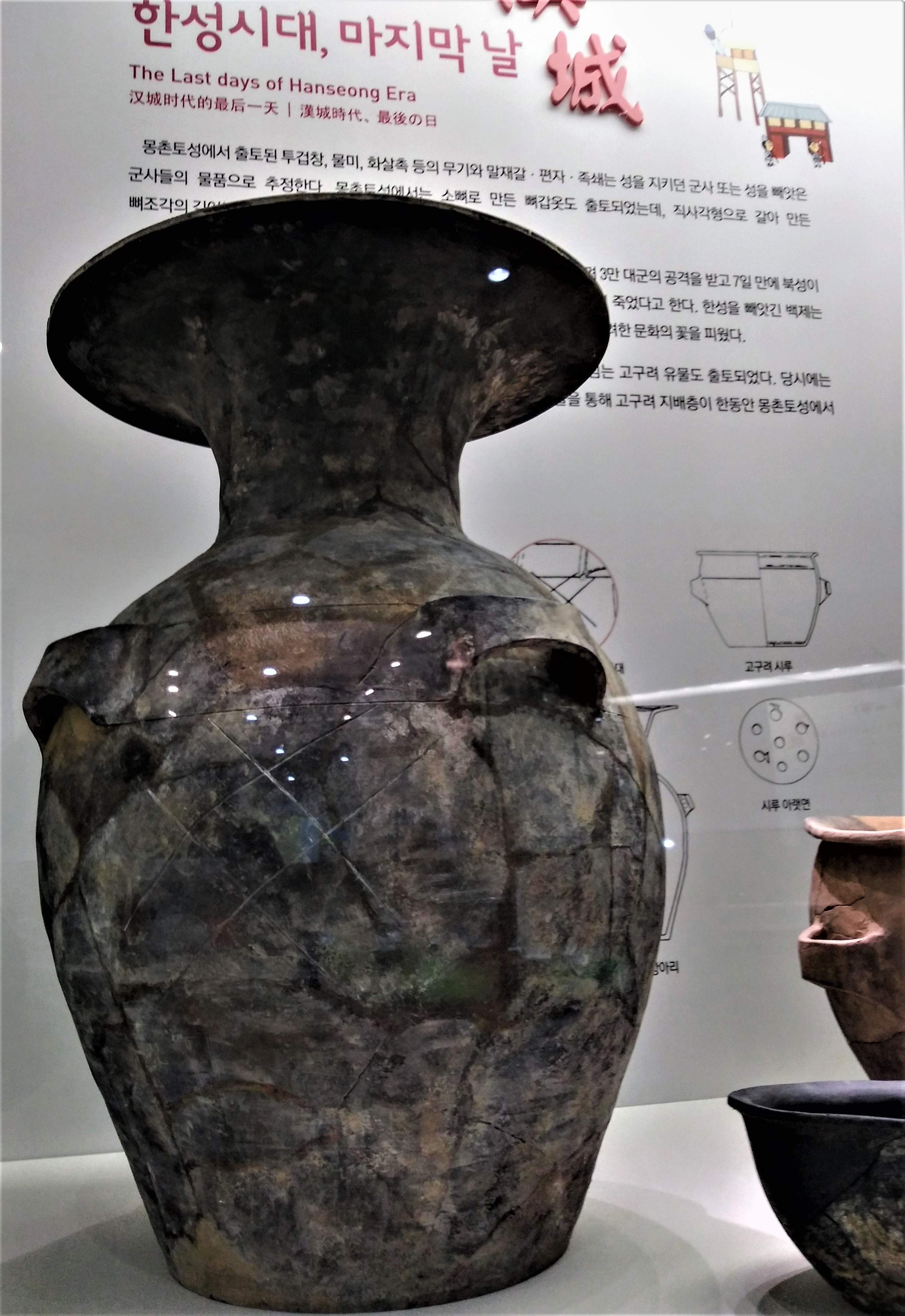그런데 몽촌토성에서는 고구려 온돌터 15개 및 상당수의 고구려 토기도 발견되었으며, 아차산성이나 구의동 보루에서 발견된 것보다 격이 높다. 고구려가 475년 백제와의 전쟁에서 승리한 뒤 이곳 몽촌토성에 안정적으로 주둔하며 백제를 지배했다는 증거이다. 아래 몽촌토성 역사관에 전시돼 있는 네귀달린 항아리에는 해시태그 문양(#)이 뚜렷해 한 눈으로 보아도 고구려 것임을 알 수 있다. 점령군인 고구려군이 남긴 유물인 것이다.