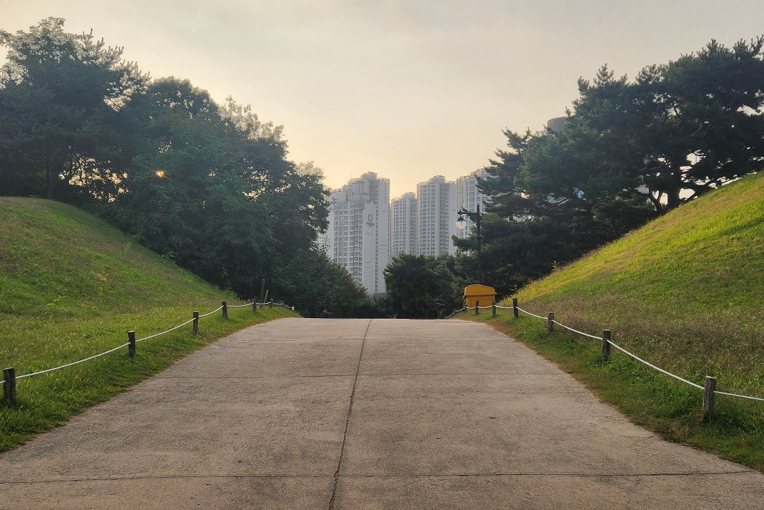 풍납토성 성벽 능선 / 풍납토성은 총 둘레 3.5킬로미터, 최대 너비 60미터, 최대 높이 13.3미터, 면적 약 24만 평의 방대한 규모의 도성이었다. 현재는 2.1킬로미터의 성벽만 남아 있다.