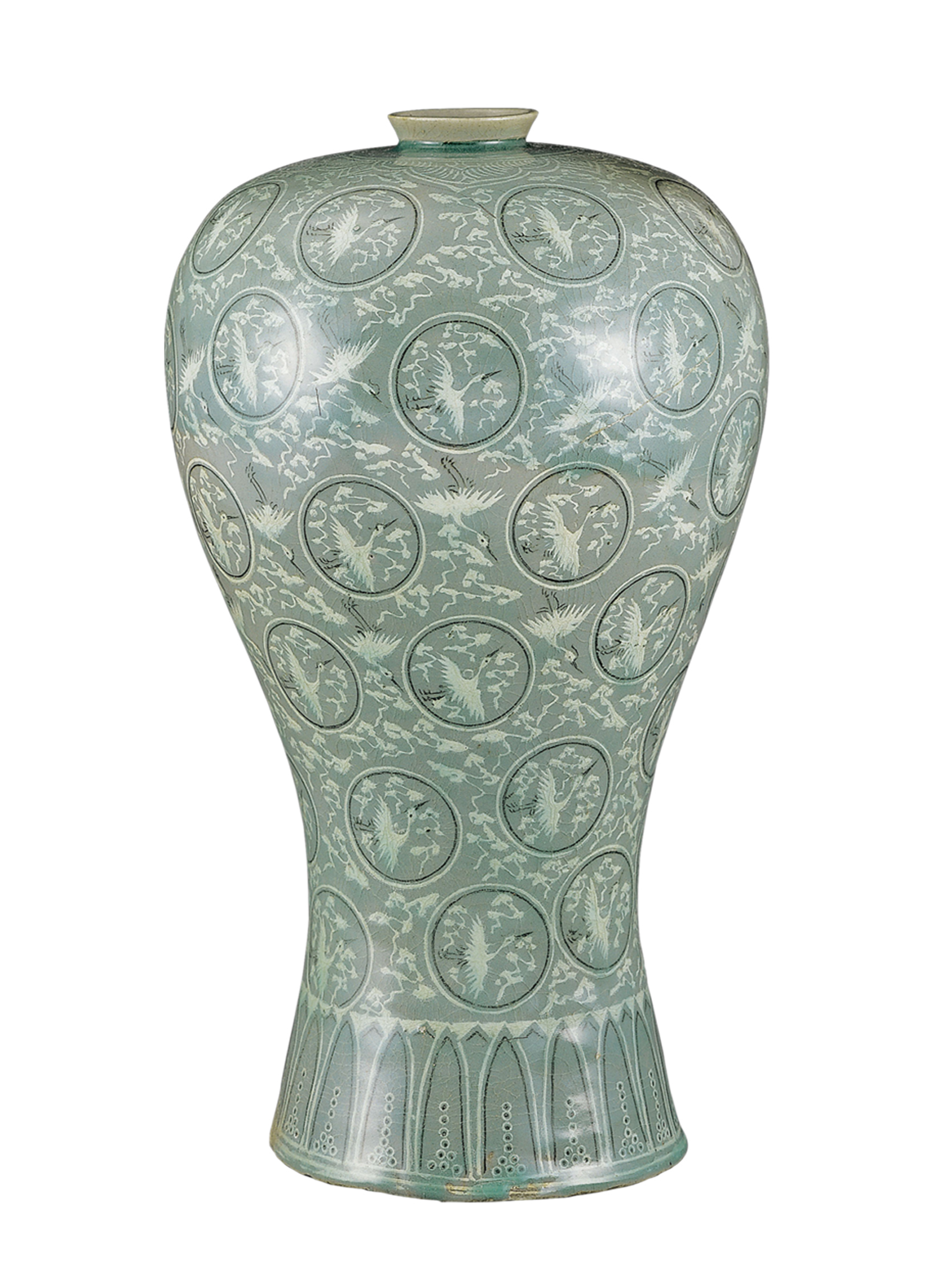 췌언을 덧붙이자면, 이 청자에는 학과 구름 문양만 있을 뿐 매화는 없다. 그런데 왜 매병(梅甁)일까? 썰은 두 가지로, 그 형태가 날개를 접고 앉아 있는 해동청 보라매를 닮은 모양이라 하여 매병이라 붙여졌다는 것이 첫 째 썰이다. 둘 째는 매화주를 담는 용도로 사용돼 매병이라 붙여졌다는 것이다.