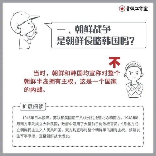한국전쟁은 남침이 아니라고 말하는 공청단 / 공청단은 단원이 8000만명이 넘는 중국 공산당 내 최대 조직 중 하나이다. 공청단은 25일 중국의 트위터 격인 웨이보(微博)에 올린 글에서 "한국전쟁은 북한이 한국을 침략한 것인가"라는 물음에 "아니다"(不)라고 강하게 부정했다. 이어 "당시 북한과 한국은 서로 한반도 전체에 대한 주권이 있다고 주장한 데서 비롯된 한 국가의 내전"이라고 설명했다. 이어진 "항미원조 전쟁에서 이겼느냐"는 물음에는 "이겼다"고 답했고, "항미원조의 기점은 압록강이었는데 세계 1강국(미국)을 압록강에서 38선으로 물리쳤으며, 미국의 북한 전역에 대한 무력 점령 시도를 송두리째 부숴버렸다"라고 덧붙였다.