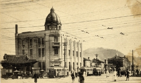 그 무렵의 대한천일은행 종로지점 건물 / 1909년 대한제국 탁지부에서 '광통관'이라는 이름으로 건립한 공공건물로, 이 건물 1층에 대한천일은행 종로지점이 개설됐다. 왼쪽으로 대동생명과 한성은행 건물이 보인다.