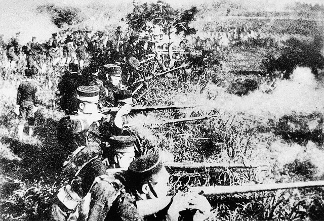 성환전투 장면 / 일본군이 자체 개발한 개인화기 무라타 소총을 갈겨대고 있다.